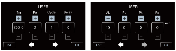 Set the maximum temperature value you want the instrument doesn’t exceed during work cycle pressing on corresponding box and using the numeric keypad. Press ENTER to confirm or ESC to return to the previous screen without saving.