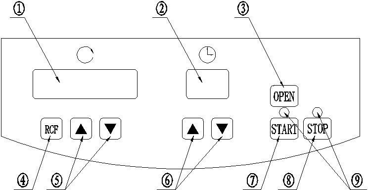 As shown in Chart 1, Pressing 4 “RCF” button in the display window 1 , it will show the RCF, press button 5 △,the RCF selection range from 0 to maximum RCF. Press button 5 ▽, the RCF will be down. Set the RCF you prefer, after the digital tube flashes twice, then the setting RCF will storage automatically.