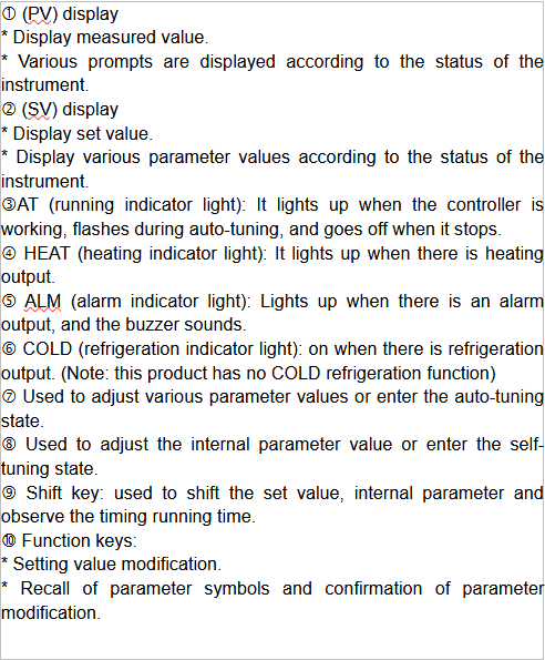 5) The temperature controller enters the working mode after about 4 seconds of self-checking procedure, that is, the PV screen displays the measured temperature, and the SV screen displays the set temperature. When PV<SV, the HEAT light should be on, indicating that the temperature controller enters the heating state.
